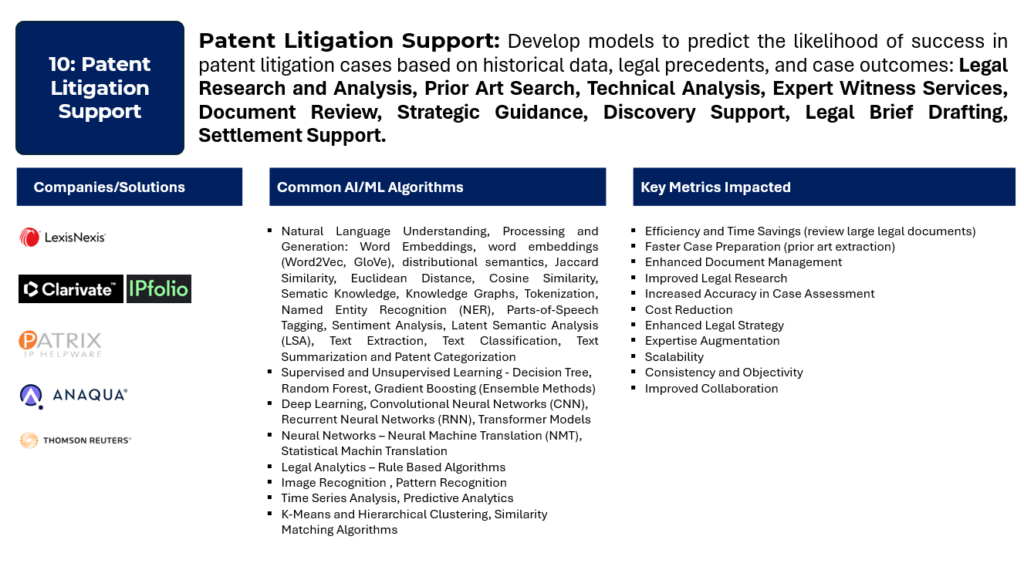 Predictive Analytics: Forecasting case outcomes, litigation risks, or potential settlement scenarios. Predicting the likelihood of success in a patent litigation case based on historical data and case-specific factors. Pattern Recognition: Identifying patterns in legal documents, patent claims, or prior art. Recognizing recurring elements that may strengthen or challenge legal arguments. Semantic Analysis: Understanding the meaning and context of legal language. Enhancing the precision of searches, identifying semantic relationships between legal terms. Supervised Machine Learning: Training models using labeled data to make predictions or classifications. Predicting outcomes, classifying legal documents, and providing support in decision-making processes. Legal Analytics: Analyzing legal data to derive insights into case strategies, judge behavior, and litigation trends. Providing data-driven insights for case assessment, strategy development, and decision-making. Document Similarity and Clustering: Identifying similarities between legal documents and clustering related documents. Grouping similar patents, prior art, or legal cases for efficient analysis. Predictive Coding for E-Discovery: Automating the review and categorization of documents in e-discovery. Accelerating the identification of relevant documents during the discovery phase of patent litigation. Expert Systems: Incorporating expert knowledge into rule-based systems.Developing systems that emulate the decision-making processes of legal experts, providing guidance in complex legal scenarios.