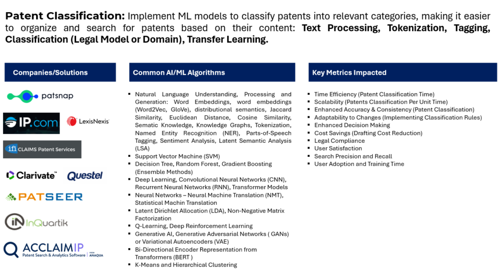 Companies that integrate these technologies into their patent platforms provide users with powerful tools for navigating and understanding patent landscapes. Google Patents uses machine learning to classify patents into technology domains. It leverages advanced search capabilities and categorization to enhance patent discovery. IBM Watson for Patents employs AI and NLP to analyze and categorize patents. It assists users in exploring and understanding patent landscapes. Clarivate Analytics utilizes AI-driven features in its Derwent Innovation platform to enhance patent classification and categorization. It aids in navigating patent data for research and analysis. Questel’s employs AI technologies for patent classification, making it easier for users to search and analyze patent information. Here are some companies that were known for leveraging AI/ML for patent classification: Gridlogics (PatSeer):  Overview: Gridlogics provides PatSeer, an AI-driven patent search and analytics platform. It utilizes machine learning techniques for patent classification, enhancing search capabilities and analysis. IFI CLAIMS Patent Services: IFI CLAIMS Patent Services is known for its patent data solutions. The company employs AI and machine learning for patent classification, providing data services and analytics for patent professionals.