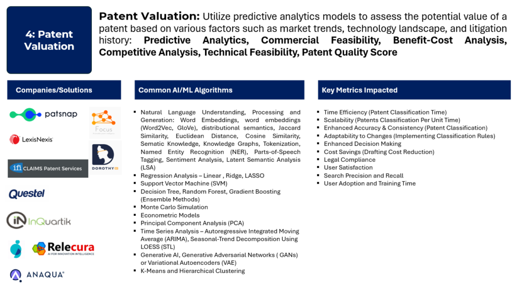 AI/ML is increasingly being applied in the field of patent valuation to provide more accurate and data-driven assessments of the economic value of intellectual property. Patent valuation involves estimating the financial worth of patents based on various factors such as technological relevance, market potential, and competitive landscape. AI algorithms analyze the technological content of patents, considering factors such as citations, references, and the technical details within the documents. Provides insights into the significance of the patented technology in relation to industry trends and advancements. AI/ML helps in predicting potential risks and challenges associated with patents, allowing companies to proactively address issues. AI/ML technologies in patent valuation empower companies to assess the economic value of their intellectual property more accurately, enabling strategic decision-making and portfolio optimization. Platforms like PatSnap, IPlytics, and Cipher demonstrate how these technologies are integrated into comprehensive patent analytics solutions.